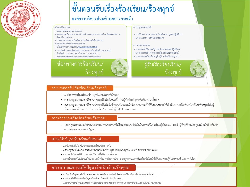 ขั้นตอนการรับเรื่องร้องเรียนร้องทุกข์ องค์การบริหารส่วนตำบลบางกระเจ้า